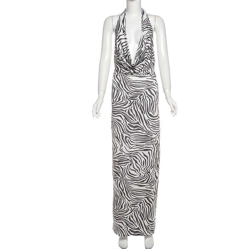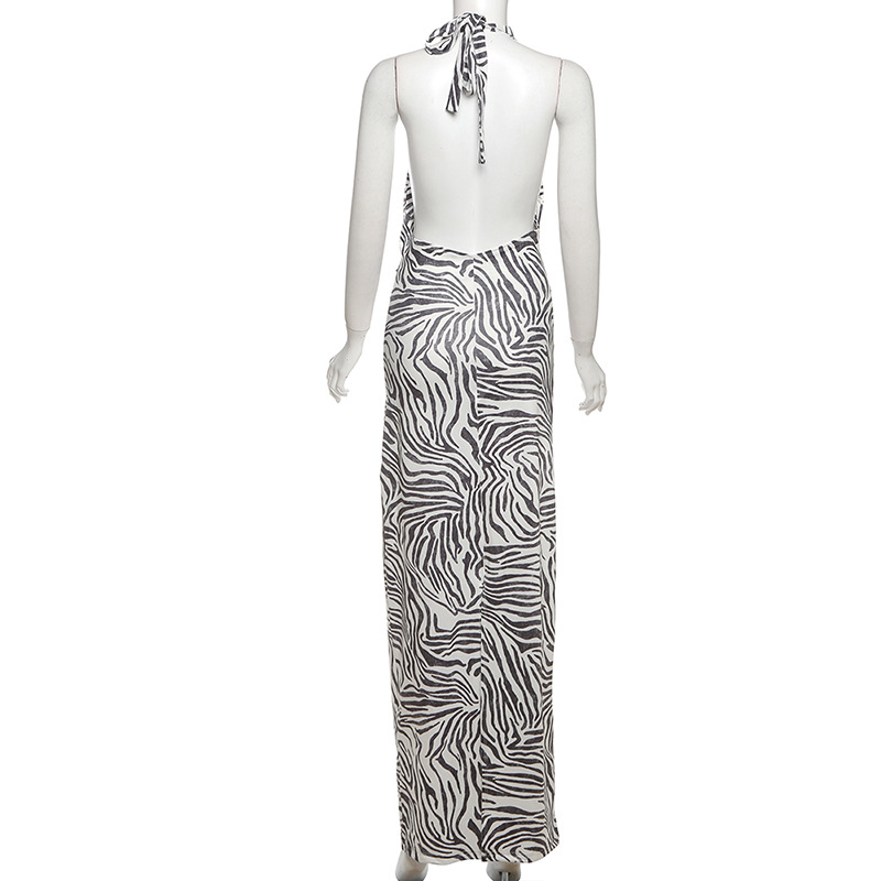 Elevate your spring wardrobe with this bold zebra pattern halter dress. Featuring a sexy deep V plunge neckline and a backless design, it combines daring style with breathable comfort. Perfect for making a confident statement at any event, this dress flatters your silhouette while keeping you cool and stylish all day or night. Embrace your individuality with this unique, eye-catching piece.